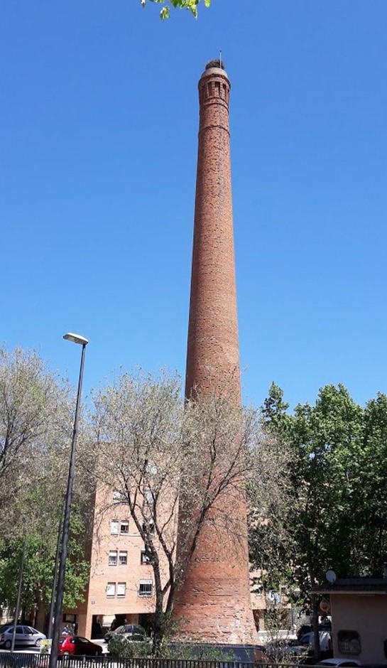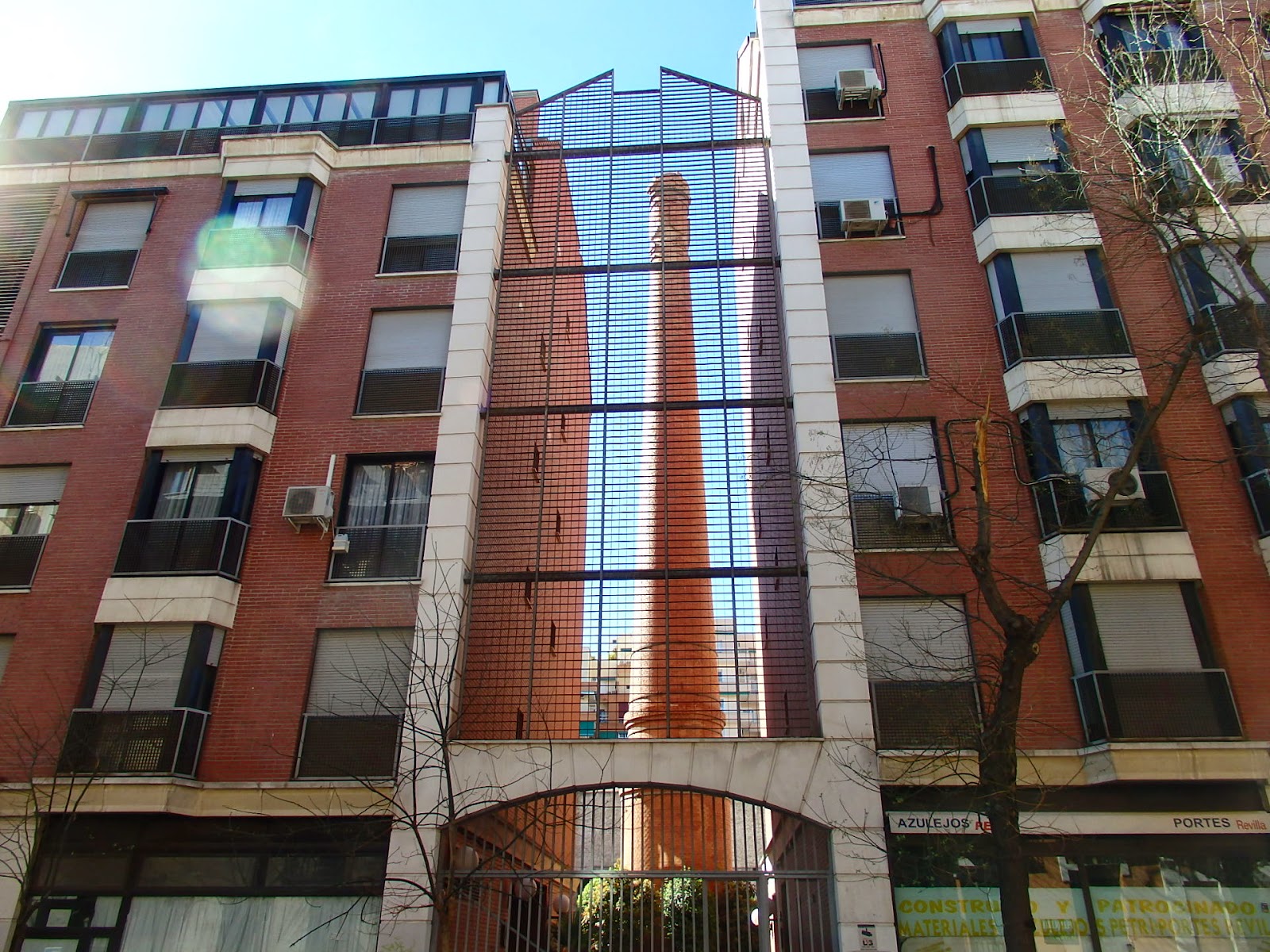 CHIMENEA DE LA ANTIGUA FÁBRICA DE VIDRIOS ARTIGAS, situada en Juan de Urbieta 13 y 15, casi esquina con la calle Valderribas. A primera vista parecería una especie de jaula, dentro de la cual se encuentra (en el interior de un patio vecinal) otra histórica chimenea de Madrid. Acercarse a ella conforma que tal medida fue un acierto: se trata de un innegable mirador para mostrarla, encajonada entre dos bloques de viviendas.