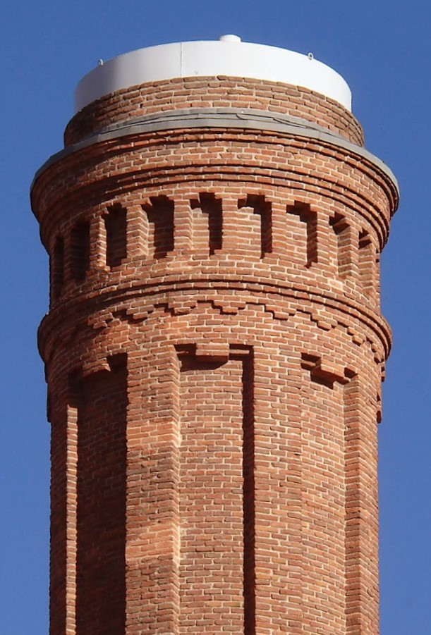 La terminación y los detalles de la chimenea del Matadero son, como todo el conjunto, de un neomudéjar contenido y elegante, ejemplo y referencia para el resto de arquitectura industrial española.