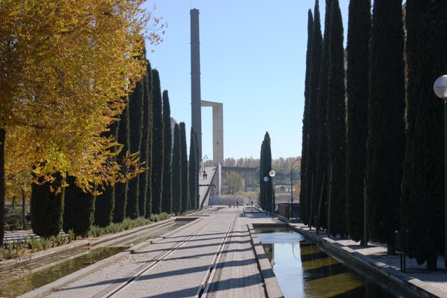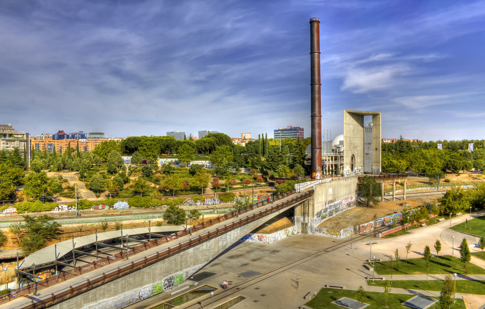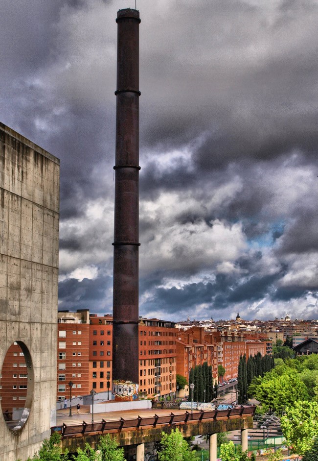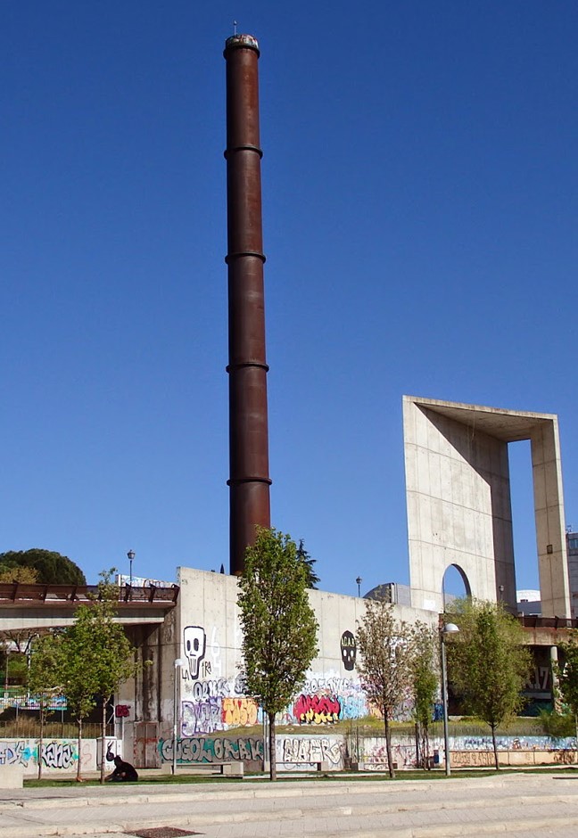 Esta chimenea de Madrid es un caso diferente. Se trata de una pasarela escultural, donde la chimenea simboliza el pasado industrial de la zona. Este puente salva las vías del ferrocarril y conecta el parque de Delicias con el Planetario y el parque Enrique Tierno Galván.