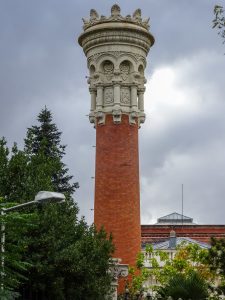 Continuamos por la preciosa chimenea que nos encontramos en el ANTIGUO MINISTERIO DE FOMENTO, situada en la cuesta de Claudio Moyano 2 (enfrente de las casetas de los libreros). Esta majestuosa y espectacular chimenea, fue construida para la salida de humos de la calefacción. Es obra del gran arquitecto Ricardo Velázquez Bosco que la diseñó y realizó en ladrillo con gran diversidad de bellos elementos decorativos.