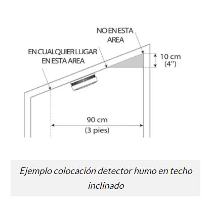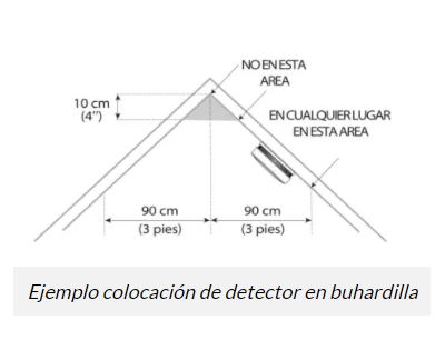 Cuando la pared o techo estén inclinados, el detector debe instalarse a un mínimo de 90 cm de la distancia de la pared o techo más alto del cuarto.