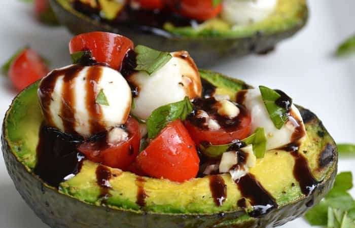 Retire los aguacates y rellene con el tomate, la mozarela y hojas de albahaca picadas.