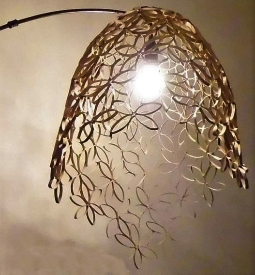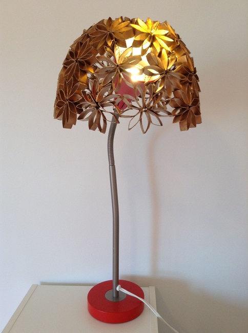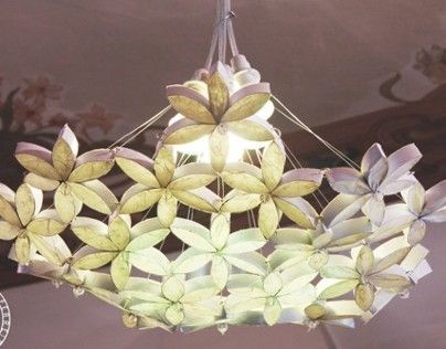 Siga pegando piezas  y rellenando los huecos para formar un diseño bonito y único. Añada los pétalos para finalizar  el diseño de su lámpara. Le recomiendo que el borde inferior no quede en línea recta porque, cuanto más asimétrica quede, más original será el diseño. Así que improvise y cuando esté satisfech@ con el resultado, deje que se seque.