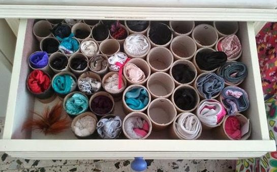 Calcetines, tangas, calzoncillos, fulares… El caos de cualquier cajón si no está ordenado. Puede poner freno a esta situación muy fácilmente usando los rollos de papel higiénico. Distribuirlos en los cajones hará que toda la ropa menuda esté perfectamente ordenada y no le cueste trabajo localizar nada.