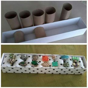 Con una caja, varios rollos de papel higiénico y papel de regalo a su gusto, tendrá un maravilloso y muy práctico organizador de anillos.