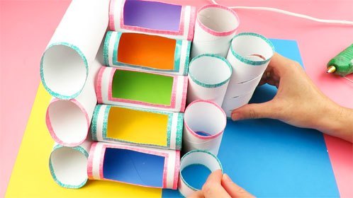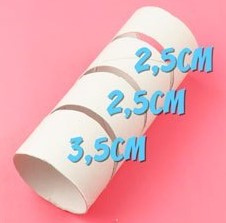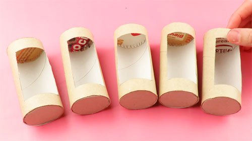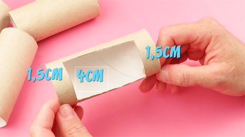 Lo primero que debemos hacer es recortar una ventana en 5 tubos de cartón de papel higiénico de 1.5 cm de ancho por 4 cm de largo.