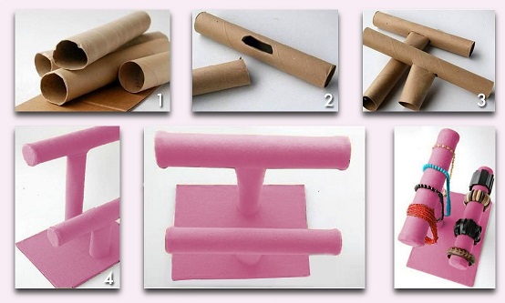 Varios rollos, un trozo de cartón, pegamento y pintura será todo lo que va a necesitar para hacer este organizador con el que tendrá todos sus collares, pulseras e incluso relojes organizados y a la vista.