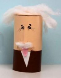 ALBERT EINSTEIN: Para hacer este personaje va a necesitar un rollo de papel higiénico gastado, papeles y cartulinas de colores, rotuladores, pegamento, tijeras y algodón. Comience forrando la parte superior con un papel de color carne. Un trozo de papel marrón con un triángulo blanco será el traje. Con cartulina de color carne haga la nariz que, a continuación, debe pegar en la cara. Con un rotulador negro dibuje la boca, los ojos y las cejas. Inspirándonos en la popular fotografía, utilice una cartulina de color rosa para hacerle una lengua. Con un rotulador dibuje algunas líneas de expresión y ya, para terminar, un poco de algodón le servirá para hacerle sus característicos pelos y un buen bigote ¡¡¡CHULÍSIMO!!!