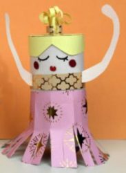 BAILARINA: Para hacer este personaje necesitará un rollo de papel higiénico gastado, rotuladores, pegamento, tijeras y papeles de colores. Con un papel color rosa muy clarito cubra todo el rollo de cartón. Con su papel estampado favorito haga el vestido que nos guste vamos a hacerle el vestido (hágalo en zigzag y luego recórtelo para simular una falda). Puede completar la parte de arriba del vestido con otro papel estampado que le guste. Con un poquito de cartulina amarilla cubra la parte de arriba del rollo de cartón y para hacerle el pelo recorte también unas tiras y la parte del flequillo. Pinte unos coloretes, unos labios bonitos y complete la parte del pelo recortando una tira de papel estampado y haciendo un trocito que le servirá como coletero. Para aguantar alguno de los pelitos puede enrollar tiras de papel y colocarlos en el centro simulando el característico moño de las bailarinas. Para finalizar añada dos brazos hacia arriba y… ¡¡¡A BAILAR!!!