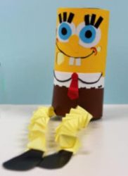 BOB ESPONJA: Para hacer este personaje va a necesitar un rollo de papel higiénico gastado, cartulina de colores, rotuladores, pegamento de barra, celo, tijeras y papeles de colores. Necesitaremos dos tonos de amarillo para crear a este personaje. Comience forrando la parte superior con el amarillo más clarito y haga la parte de la camisa con un papel de color blanco. Con el amarillo más oscuro debe realizar unos agujeritos que debe superponerlos encima del amarillo más clarito para crear el efecto esponja. A continuación haga el cuello y una corbatita de color rojo. Con un papel de color marrón haremos los pantalones y a continuación nos dedicaremos a hacer las patitas. Utilice dos tiras de color amarillo que debe ir entrecruzando para hacer un efecto muelle que serán las patitas de Bob Esponja. y con un papel de color negro le haremos los zapatos. Para terminar le ponga todos los detalles para caracterizan a este personaje: unos ojos bien saltones, con sus pestañas, su nariz, y unos dientecitos.