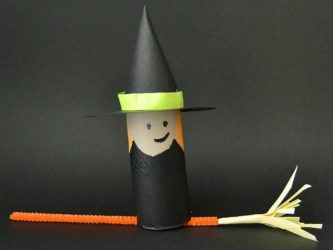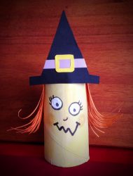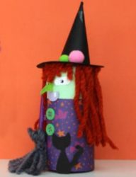 Para hacer ésta va a necesitar un rollo de papel higiénico gastado, cartulina de colores, rotuladores, pegamento de barra, tijeras, lana, una pajita y papeles de colores. En primer lugar forre el rollo de cartón con un poco de papel verde y con un papel estampado haga la parte del vestido (al que puede pegar un par de botones en la parte delantera). Con un poco de cartulina negra recorte un gato y a continuación haga una escoba. Un poco de lana (que debe atar muy bien) hará las veces de cepillo y un trozo de pajita será el palo de la escoba. Utilice lana de color rojo para hacer el pelo y un poco de cartulina negra para hacer el sombrero (puede hacer un par de bolitas para adornar el sombrero). Haga unos ojos, una gran nariz y una boca y ya estará lista su bruja.