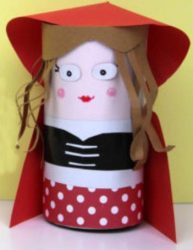 CAPERUCITA ROJA: Para hacer este personaje va a necesitar un rollo de papel higiénico gastado, cartulina de colores, rotuladores, pegamento de barra, tijeras y papeles de colores. Cubra la parte de arriba del tubo de cartón con un papel rosita y utilice para la parte de abajo un papel estampado con lunares. Para la parte de arriba  recorte un rectángulo blanco y otro de color negro doblado por la mitad que debe redondear un poco dándole forma de corazón y hacer 3 pequeñas ranuras, desdoblarlo y pegarlo sobre la parte blanca. A continuación continúe con el pelo, para esto utilice una cartulina de color marrón, recorte algunas tiras y dele un poco de forma, recorte una silueta para la parte del flequillo y con un redondel taparemos la parte de arriba de su tubo de cartón. Para terminar el personaje, sólo falta la capa. Recorte un círculo y haga un pequeño corte hasta el centro, esto le servirá para hacer la parte de la capucha y con un rectángulo al que debemos recortar y dar un poco de forma haga la capa lo péguelo todo bien y ya tenemos lista a nuestra Caperucita Roja 🙂