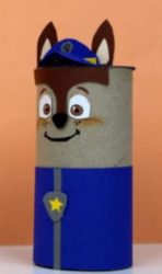 CHASE: Para hacer este personaje va a necesitar un rollo de papel higiénico gastado, cartulina de colores, rotuladores, pegamento de barra, tijeras y papeles de colores. Utilice una cartulina de color azul para cubrir la parte de abajo de su rollo de cartón, esto le servirá para hacer el vestido de Chase. Con la misma cartulina azul debe hacer un círculo del mismo tamaño que el diámetro del rollo y lo debe utilizar para tapar la parte de arriba. Recorte una tira finita de cartulina gris y ya puede ponerse manos a la obra con el escudo y la estrellita que decorar el uniforme del famoso perro policía. En una cartulina azul debe cortar dos medias lunas y puede darle un poco de forma para que parezca una gorra real (decore con una tira de color amarillo y un escudo en color gris). Monte primero la parte de arriba y luego la visera. Recorte en una carulina de color marrón una forma de T que le ayudará a decorar la cara del personaje. Con ese mismo color recorte unas orejas y en su interior coloque un papel en un tono asalmonado para acabar de decorarlas. Una forma similar a una castaña en una cartulina negra le servirá para hacer la nariz y acto seguido continuamos con los ojos. Tenga en cuenta que no son redondos del todo así que intente recortar una forma curva por arriba y un poquito más recta por la parte de abajo como si fueran dos ventanitas, pinte de color marrón la parte del iris dejando siempre una zona blanca para que quede los ojos más brillantes, continúe con las pupilas y sombree un poquito la parte superior del ojo como si fuera los párpados. Una vez los tenga debemos pegarlos pero antes dibuje una sonrisa, unas pequitas y después dibuje las cejas y, para finalizar, dele forma a los mofletes con la ayuda de un lápiz de color marrón.