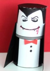 DRÁCULA: Para hacer este personaje va a necesitar un rollo de papel higiénico gastado, rotuladores, pegamento de barra, tijeras, cintas de washi de color negro y papeles de colores. En primer lugar forre el tubo de cartón con papel de color blanco. Con una cartulina negra le haga un círculo para la parte de arriba. Con cintas de washi tape de color negro haga el traje. Con una cartulina negra recorte la capa que posteriormente debe pegar y haga lo mismo con el círculo que recortamos al principio. Con una cartulina roja haga la pajarita y con un rotulador negro remarte los detalles (unos ojos con unas ojeras bien negras y el característico pelo). Para terminar dibuje la boca con unos colmillos y un poco de sangre y hemos terminado el personaje 🙂