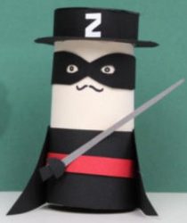 EL ZORRO: Para hacer este personaje va a necesitar un rollo de papel higiénico gastado, cartulina de colores, rotuladores, pegamento de barra, tijeras y papeles de colores. Comience cubriendo la parte de arriba del rollo de cartón con un papel clarito para hacer la cara y en la parte inferior con una cartulina en color negro. Recorte un círculo bastante grande en cartulina de color negro para hacer el ala del sombrero y con una tira que no sea demasiado alta haga la base de ese sombrero al que debe cortar también un círculo algo más chiquitito para tapar la parte de arriba. Péguelo todo bien para completar el característico sombrero del personaje del zorro. Recorte una tira en color rojo para hacer un cinturón y además añadiremos la Z de zorro en la parte delantera de ese sombrero con papel o cartulina blanca. Doble una tira de color negro a la mitad y recorte en forma del antifaz, haga el agujerito de los ojos y deje la parte de atrás algo más estrecha que la parte de delante. Pegue después en la zona de los ojos y a continuación le añada una capa. Prepare, por supuesto, su espada. Para hacerla necesita cartulina gris para la parte de arriba (dando una forma más estrecha a medida que llega a la punta) y para la parte de abajo vamos a utilice una cartulina en color negro. Para finalizar pinte con rotulador de color negro los bigotes y dibuje también los ojos.
