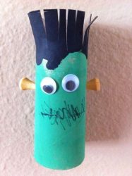 FRANKENSTEIN: Para hacer este personaje va a necesitar un rollo de papel higiénico gastado, rotuladores, pegamento, tijeras, ojos móviles y papel de plata. Comience recortando la parte superior del rollo en tiras más o menos del mismo grosor. Una vez terminada de cortar debe colorear de negro las partes recortadas (será el cabello). El resto del cuerpo debe colorearlo en un tono verde. Una vez ha dado color a todo el rollo, nos ponemos con los detalles. Pinte la boca haciendo garabatos con un rotulador negro, pegue 2 ojos móviles y haga un par de tornillos con papel de plata que debe colocar en la parte de la sien. Una versión muy sencilla del personaje 😉