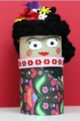 FRIDA KAHLO: Para hacer este personaje va a necesitar un rollo de papel higiénico gastado, cartulina de colores, rotuladores, pegamento de barra, lana de color negro, papel de seda, tijeras y papeles de colores. En primer lugar busque un papel estampado que sea bonito y forre el rollo como si fuera un vestido. Realice un círculo en cartulina negra y una tira para hacer la parte del pelo. Con un poco de papel blanco haga unos ojos y a continuación un chal con un recorte de tela, puede adornarlo con alguna cinta bonita para tapar la junta. Con un poco de lana de color negro haga una trenza bien gruesa. Utilice un rotulador negro para hacer las pestañas y sus características cejas. Pinte los labios y los coloretes. Pegue el pelo sobre la cartulina negra que ha puesto anteriormente. Con un poco de papel de seda de colores puede hacer unas flores para el pelo.