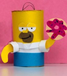 HOMER SIMPSON: Para hacer este personaje va a necesitar un rollo de papel higiénico gastado, cartulina de colores, rotuladores, pegamento de barra, tijeras y papeles de colores. Empezaremos cubriendo la parte de arriba de nuestro rollo de cartón con un papel de color amarillo. Para la ropa debe utilizar una tira finita de color blanco y otra tira un poquito más gruesa en color azul. Debe continuar haciendo un círculo de color amarillo para tapar la parte de arriba. Le haremos el cuello de la camisa con un papel de color blanco y, a continuación, continuamos con la cara. Debe recortar unos círculos blancos para los ojos y medios círculos en color amarillo para los párpados. Luego sólo debe pintar un punto negro para hacer la pupila. Para terminar, con una cartulina negra le añadiremos los pelitos tan característicos de Homer Simpson, le haremos los brazos y, cómo no, una deliciosa rosquilla 😉