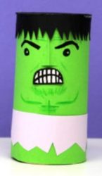 HULK: Para hacer este personaje va a necesitar un rollo de papel higiénico gastado, cartulina de colores, rotuladores, pegamento de barra, tijeras y papeles de colores. Comience cubriendo el rollo de cartón con un papel de color verde bastante intenso. Haga un círculo de color negro para la parte de arriba y una tira del mismo color al que le debe hacer unos triángulos desiguales para simular el flequillo. A continuación, recorte una tira un poco más gruesa que la que ha cortado antes en color lila y hágale también unos triángulos desiguales para simular la ropa. Haga un triángulo de color verde para la nariz y media esfera en color blanco para hacer la boca. Con un rotulador de color negro marque todo el contorno de la boca, pinte los dientes y una vez tenga todo esto listo le pegue los distintos elementos. Con un lápiz o rotulador de color verde marque todos los músculos de la parte abdominal y, para terminar, dibuje los ojos y las cejas enfadadas.