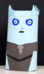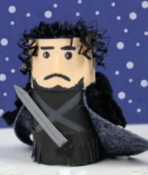 JON SNOW: Para hacer este personaje va a necesitar un rollo de papel higiénico gastado, cartulina de colores, rotuladores, pegamento, tijeras, fieltro gris, lana negra y papeles de colores. En primer lugar, con un papel de color carne haga la parte de la cara y para la parte inferior utilice una cartulina negra para hacer el traje de Jon Snow. Con una circunferencia de cartulina negra tape la parte de arriba del rollo de cartón  y con una tira de cartulina negra le haga los flecos de su vestido. Con un lápiz de color gris acabe de dibujar el traje, pegue los detalles, pegue la cabeza, a continuación continúe haciendo el pelo de Jon Snow. Recorte unas tiras de cartulina negra que debe doblar en forma de zig zag y con ayuda de pegamento vaya pegándola a la parte superior. Con una cartulina gris haga una espada y con un poquito de cartulina de color carne la nariz. A continuación haga la capa, para eso use un poco de fieltro y lana de color negro. Para finalizar haga los detalles de la cara (ojos, cejas, bigote y una barba).