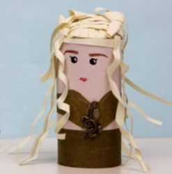 KHALEESI: Para hacer este personaje va a necesitar un rollo de papel higiénico gastado, cartulina de colores, rotuladores, pegamento de barra, tijeras, papel de seda y papeles de colores. Para comenzar, lo primero es dejar preparadas unas tiras de papel de color amarillo muy pálido para hacer el cabello. Dóblelas en forma de zigzag y estírelas después para darles forma ondulada. Cubra la parte superior del rollo de cartón con papel rosa clarito. Para hacer el vestido utilice papel de seda de color marrón y corte dos piezas. La que utilice para la parte de arriba debe doblarla por la mitad, hacerla un pequeño corte para darle forma de corazón en la parte de arriba para terminarla con forma de triángulo. Para la parte de abajo del vestido recorte un rectángulo que simulará la falda. Continuamos con el cabello (la parte más complicada del personaje). Para que les os quede bien les recomiendo primero hacer un círculo de color amarillo muy clarito que servirá como base y que puede utilizar tomando como medida de referencia el agujero del tubo de cartón. Primero de todo pegue algunas tiras de delante hacia atrás y luego coloque algunas tiras también en los laterales simulando que tiene una raya en el lado con la idea de simular los característicos peinados de khaleesi en la serie. Puede utilizar algunas de las tiras de papel enrollándolas para simular trenzas y poco a poco irá recogiendo y dando forma al cabello. Para conseguir que el cabello tenga más volumen haga una bolita de papel, arrúguela e introdúzcala en el agujero del tubo de cartón para ir pegando el cabello para acabar dando forma y poder pegar todos los mechones (puede hacer un pequeño flequillo para tapar la parte más fea. Además, ayudará a dar más realismo al personaje, que utilice unas tiras de papel para recoger el pelo hacia atrás y poder así dejar algunos tirabuzones por la parte delantera más sueltos. Para acabar de dar personalidad al personaje debe dibujar unos ojos, sus características cejas con un rotulador de color marrón y puede terminar decorándole con un  abalorio en forma de dragón.