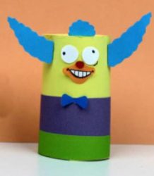 PAYASO KRUSTY: Para hacer este personaje va a necesitar un rollo de papel higiénico gastado, cartulina de colores, rotuladores, pegamento de barra, tijeras y papeles de colores. Con un papel amarillo clarito cubra el tubo de cartón. A continuación haga un círculo que le servirá para tapar la parte superior de nuestro personaje. Para hacer la ropa debe recortar una tira en color lila que será la camisa y una tira en color verde un poquito más finita para hacer el pantalón. Con un papel de color azul haga una pajarita y a continuación haremos la cara. Recorte dos círculos de color blanco a los que debe dibujar unos ojos un poco locos (uno por aquí y otro por allá). Con un papel de color naranja recorte la parte de la boca y haga una media luna en color blanco para hacer la sonrisa. Dibuje los dientes y luego debe pegarlo añadiendo una nariz de color rojo. Para terminar, sólo falta su particular peinado que haremos con una cartulina de color azul. Debemos recortar unos “churros” súper largos para los lados y un “churrito” un poquito más chiquitín que irá en el centro. Debemos pegar todos bien y ya tenemos a nuestro Payaso Krusty.