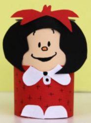 MAFALDA: Para hacer este personaje va a necesitar un rollo de papel higiénico gastado, cartulina de colores, rotuladores, pegamento de barra, tijeras y papeles de colores. Comience cubriendo la parte de arriba del rollo de cartón con un papel rosado clarito. Recorte una tira de papel rojo para hacer el vestido que puede decorar pintando unas crucecitas con un rotulador. Con un papel de color blanco le haga el cuello del vestido. A continuación haremos el pelo. Para hacerlo lo primero que debe hacer será recortar un círculo para tapar la parte de arriba del tubo de cartón y en una cartulina negra recorte la silueta de su peculiar pelo, siempre dejando el hueco de la carita vacío para poder pegarlo directamente sobre el tubo. Con un papel de color rojo recorte el lazo y péguelo en la parte de arriba del pelo. Haga también unas zapatillas blancas para colocar en la parte inferior del tubo. Para finalizar dibuje la cara con un rotulador de color negro y decore también el cuello del vestido pintando un par de botones y ya tenemos a Mafalda lista 🙂