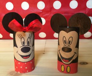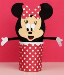 MINNIE Y MIKEY MOUSE: Para hacer este personaje va a necesitar un rollo de papel higiénico gastado, cartulina de colores, rotuladores, pegamento de barra, tijeras y papeles de colores. Para comenzar, cubra la parte de arriba del rollo de cartón con un papel de color negro. Cubra la parte de abajo con un papel estampado de topos blancos. Con una tira de papel de color blanco haga una puntillita que debe colocar en la parte superior del vestido de Minnie Mouse. Recorte en una cartulina negra la particular forma de la cara de Minnie y añada un papel de color rosa clarito para la parte de dentro en la que debe pintar boca, nariz y ojos. Añada el lacito con el mismo papel de topos que ha hecho el vestido y ya solo faltará hacerle dos bracitos para lo que debe usar unas tiras de cartulina negra y un unas cartulinas de color blanco para hacer las manos. Y ya tenemos a Minnie Mouse lista. Si prefiere algo más sencillo, le mostramos esta otra propuesta hecha a base de pinturas.