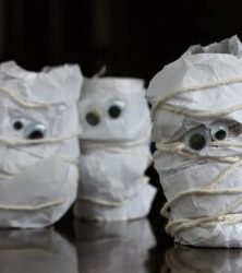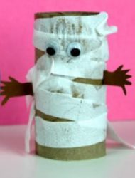 MOMIAS: Para hacer este personaje va a necesitar un rollo de papel higiénico gastado, rotuladores, cola blanca, tijeras, cartulina oscura, ojos móviles y papel higiénico. Lo primero que debe hacer es una mezcla de un poco de cola y agua a partes iguales. A continuación recorte unas tiras de papel higiénico que debe ir pegando poco a poco en el rollo. Una vez haya finalizado con las tiras de papel, recorte unas manos con cartulina para añadirlas al personaje, pegue unos ojos móviles y tenga mucho cuidado… ¡¡¡LA MOMIA ESTÁ LISTA!!!