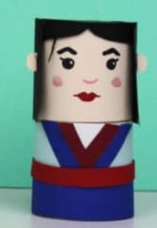 MULAN: Para realizar esta manualidad va a necesitar un rollo de papel higiénico gastado, cartulina de colores, rotuladores, pegamento de barra, tijeras y papeles de colores. Para realizar esta manualidad debe cubrir la parte de arriba del rollo con un papel de color clarito y para la parte superior debe pegar una cartulina negra que debe recortar en forma de círculo y le servirá para tapar el agujero. A continuación terminará la parte del cabello añadiéndole un mechón del flequillo y su característica media melena. La parte restante del tubo de cartón debe cubrirla con un papel azul clarito. Para  darle más realismo al traje, debe añadir en la parte de abajo una tira más chiquitita de color azul oscuro, una especie de cinturón rojo y le haremos unas uves combinando esos dos mismos colores y las situaremos en la parte delantera del cuello. Lo único que nos queda en pintar las facciones de la cara: ojos rasgados, cejas, una pequeña nariz, labios rojos, rubor en las mejillas y… ¡¡¡YA ESTÁ LISTO NUESTRO MUÑECO DE MULAN!!!