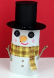 MUÑECO DE NIEVE: Para hacer este personaje va a necesitar un rollo de papel higiénico gastado, cartulinas de colores, un trozo de tela estampado, dos botones negros, lápices de colores, tijeras, pegamento y unas ramitas para los brazos. Para comenzar si el rollo que tiene no es de color blanco, debemos forrarlo con papel blanco. A continuación debe hacer un sombrero con cartulina negra, con la de color naranja debe hacer un cono que será nariz, con la tela estampada haremos la bufanda y utilizaremos los botones para los ojos. Una vez que tenga preparados todos lo elementos sólo quedará pegarlos en nuestro rollo de cartón. Para finalizar decore con lápices de colores haciendo una sonrisa, unos coloretes y unos botones.