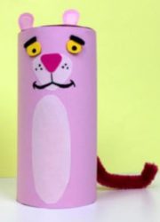 PANTERA ROSA: Para hacer este personaje va a necesitar un rollo de papel higiénico gastado, cartulina de colores, rotuladores, pegamento de barra, papeles de colores, tijeras y limpia pipas. Comience cubriendo el rollo de cartón con un papel de color rosa. Haga un círculo de cartulina rosa para tapar la parte de arriba y a recorte y pegue las orejas. Con un color rosa un poquito más oscuro recorte una nariz y con un rosa algo más clarito haga la barriguita que en este caso será muy estrecha y alargada para dar sensación de altitud. Con ese mismo color recorte la parte del morrete. Pegue el morro y con la ayuda de un rotulador de color negro termine de decorarlo. Continuamos recortando unos redondeles en cartulina de color amarillo para hacerle los ojos, sin olvidar sus características cejas un poquito tristonas, que debe recortarlas con cartulina negra y pegarlas encima de los ojos. Para finalizar, con un trocito de limpia pipas de color rosa haga la cola y… ¡¡¡LISTO!!!
