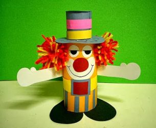 PAYASO: Para hacer este personaje va a necesitar un rollo de papel higiénico gastado, cartulinas y papeles de colores, tijeras, lana de colores y pegamento. Para comenzar con este personaje coloque un papel naranja que cubra el rollo al completo. Después recorte papeles de colores t vaya pegándolos hasta crearlos pantalones, el cinturón y la hebilla. Recorte un círculo más grande del diámetro del rollo de color gris para hacer el sombrero y recorte también una tira que será la copa del sombrero a la que puede pegarle tiras más estrechas de diferentes colores para que resulte más simpático. Pegue primero los trozos de lana intercambiando colores para crear sus pelos “locos” y remate pegando el sombrero. Recorte también dos bracitos que pegaremos al tubo, la forma de la boca tan característica y los ojos. Terminaremos de decorar la cara con un rotulador negro con el que pintaremos la sonrisa y remataremos los ojos y, ya para finalizar con el rostro, recortaremos una gran nariz roja, tan característica 🙂