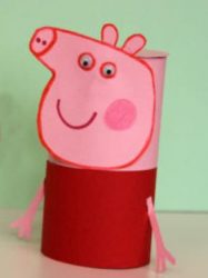 PEPPA PIG: Para hacer este personaje va a necesitar un rollo de papel higiénico gastado, cartulina de colores, rotuladores, pegamento de barra, papeles de colores, tijeras y ojos móviles. Empezaremos cubriendo la parte de arriba de nuestro rollo de cartón con un papel rosa y la de abajo con uno de color rojo. En la cartulina rosa haga un redondel para pegarlo en la parte superior y sellar su rollo. Dibuje la característica forma de la cara de Peppa Pig repasándola con un rotulador rojo sin olvidar ponerle ojos móviles. Decore la cara con unos coloretes, una bonita sonrisa, recorte unas orejitas con cartulina rosa y unos bracitos para para finalizar 🙂