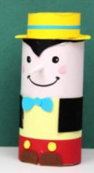 PINOCHO: Para hacer este personaje va a necesitar un rollo de papel higiénico gastado, cartulina de colores, rotuladores, pegamento de barra, tijeras y papeles de colores. Cubra la parte de arriba del rollo de cartón con un papel rosa clarito. A continuación coja una tira de color amarillo que servirá para hacer la parte de arriba de la camisa de Pinocho, una tira de color rojo para hacer junto con una cartulina negra para hacer un chalequito. Esto será suficiente para crear el look de Pinocho. A continuación nos haremos algunos detalles para terminar de completar la vestimenta de Pinocho. Haremos unos botones marrones en la parte de abajo del pantalón, lo botones amarillos y por supuesto una pajarita de color azul que no puede faltar en la parte del cuello. Para el pelo recorte una tira de color negro en la que debe hacer una parte en forma de pico por la zona centro. Recorte un círculo un poquito más ancho que el diámetro del rollo de papel para hacer el sombrero (hágalo con un color amarillo bastante intenso) y a continuación recorte una tira que le servirá para hacer la parte de arriba con otro círculo para terminar de decorar el sombrero con una tira de color azul. Recorte medio círculo del mismo color con el que ha hecho la carita de Pinocho para hacerle la nariz que debe enrollar hasta conseguir un cono finito que será su peculiar nariz. Para finalizar coloque unos círculos chiquititos en las mejillas con un color rosarito para hacerle unos coloretes le pintaremos los ojos y también la boca.