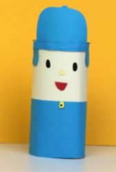 POCOYÓ: Para hacer este personaje va a necesitar un rollo de papel higiénico gastado, cartulina de colores, rotuladores, pegamento de barra, tijeras y papeles de colores. Cubra el rollo de cartón con un papel de color clarito para la parte de la cara y el característico color azul del traje de Pocoyó. Con el mismo tono de azul cubra la parte de arriba del tubo de cartón. A continuación haga el sombrero, recorte una especie de media circunferencia con una montañita en la parte superior típica del sombrero que lleva pocoyó, haga también una tira más finita para la parte de abajo y pegue todo muy bien. Recorte también dos piececitas para los laterales de este gorrito. Recorte también una piececita en amarillo que terminará de completar el traje de Pocoyó. Para finalizar el personaje pinte los ojitos, recorte una nariz redondita chiquitita y una sonrisa.