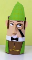 SHERLOCK HOLMES: Para hacer este personaje va a necesitar un rollo de papel higiénico gastado, cartulina de colores, rotuladores, pegamento de barra, tijeras y papeles de colores. Comience cubriendo la parte de arriba con un papel asalmonado y la parte de abajo con un papel marrón. Con una tira de cartulina blanca haga el cuello del traje y complete con un poco de papel verde simulando la característica chaqueta de Sherlock. Después de hacer la solapas de la chaqueta, haga la pajarita y pinte unos botones. Continúe con el característico gorro para lo que necesitará cartulina de color verde recortada con esa forma tan característica. Pegue una nariz y haga la característica lupa.  Para generar el efecto de agrandar por la lupa, haga un ojo un pelín más grande que el otro. Y ya para terminar haga las características patillas con un poco de papel marrón y unas orejas, dibuje las cejas, una pequeña sonrisa y le pegue un poco de cartulina blanca simulando la perilla. Con pintura dorada pinte un adorno en el traje y ya está listo Sherlock Holmes.