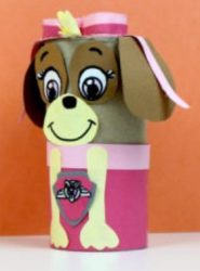 SKYE: Para hacer este personaje va a necesitar un rollo de papel higiénico gastado, cartulina de colores, rotuladores, pegamento de barra, tijeras y papeles de colores. En primer lugar haga el vestido con un poco de cartulina de color fucsia. Con una tira de un rosa más clarito tape la Junta y a continuación le haga su insignia. Con una cartulina de color marrón le haga las orejas y unos redondeles para os ojos. Con un color más clarito, amarillito, haga el hocico. En un trocito de papel blanco dibuje los ojos. Pegue una nariz negra en el hocico y haga sus pelos característicos del flequillo. Con una cartulina de un rosa más clarito haga las gafas, dibuje una forma para la base y con un par de tiras haga los dos redondeles para los ojos. Pegue todos los elementos en el tubo de cartón. Haga unas patitas y ya tiene el personaje de la patrulla canina.
