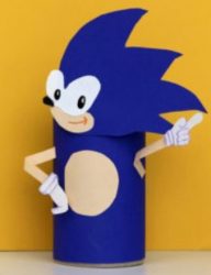 SONIC: Para hacer este personaje va a necesitar un rollo de papel higiénico gastado, cartulina de colores, rotuladores, pegamento de barra, tijeras y papeles de colores. Comience forrando el rollo de cartón con un papel azul eléctrico. Con una cartulina del mismo color azul recorte la silueta de la cara sin olvidar su particular peinado. Con un color clarito haga la parte del hocico, para los ojos utilice un papel de color blanco y resalte la punta del hocico con una naricilla en color negro. Dibuje los ojos y también una sonrisa. Con el mismo tono del hocico haga unos brazos y termine haciendo las manos con un papel de color blanco. Pegue un círculo de color clarito para la parte de la barriguita. Pegue todos los elementos y está listo 🙂