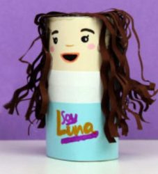 SOY LUNA: Para hacer este personaje va a necesitar un rollo de papel higiénico gastado, cartulina de colores, rotuladores, pegamento de barra, tijeras y papeles de colores. Para comenzar cubra la parte de arriba del rollo de cartón con un papel en color clarito. Para la camiseta utilice una tira de color blanco y para la parte de abajo una de color azul clarito un poquito más colorido. Con el mismo color clarito que ha utilizado para hacer la cara de la manualidad de Soy Luna haga un círculo para tapar la parte de arriba. Para hacer el cabello de la protagonista debe recortar unas tiras finitas en color marrón que irá rizando poco a poco con la ayuda de los dedos. Con mucha paciencia y con la ayuda de unas pinzas debe ir pegando los mechones de pelo para simular el peinado característico de la protagonista haciendo la raya al medio y colocando los pelitos a cada uno de los lados. A continuación ponga un poquito de pegamento en los laterales y baje el pelo para que quede mejor peinada. Con la ayuda de algunos rotuladores y colores personalice la cara del personaje. Pinte los ojos, las pestañas y las cejas y su característica sonrisa. Para finalizar, dibuje el logo de la serie en la ropa del personaje y ¡¡¡LISTO!!!