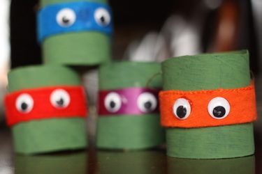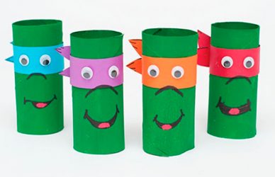 TORTUGAS NINJA: Le proponemos dos formas de hacerlas, dependiendo del número de rollos de papel con los que cuente (para los más pequeños dividimos cada rollo en dos o tres partes). Sólo necesita rollos de papel, pintura verde, una cinta de color o una cartulina, tijeras, pegamento y ojos móviles.