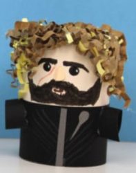 TYRION LANNIESTER: Para hacer este personaje va a necesitar un rollo de papel higiénico gastado, cartulina de colores, rotuladores, pegamento de barra, tijeras y papeles de colores. Para comenzar recorte un poquito del rollo de cartón, cubra la parte de arriba con una cartulina de un color clarito y la parte de abajo con una cartulina de color negro. Con un papel de color marrón cubra la parte de arriba del rollo. Recorte algunas tiras también es color marrón y en un color amarillo clarito que le servirá para hacer el pelo que debe ir ondulando un poquito para simular el pelo este personaje. Con pegamento debe ir pegando todos los pelos y combinando algunos marrones y algunos rubios. Con unas tiras de cartulina de color negro haga unas hombreras que le darán corpulencia al look del personaje. Con un lápiz gris haga unas rayitas en la parte frontal del traje y con cartulina gris haga una tira y la característica aguja que lleva en el traje. Péguelas y ya tienen caracterizado el traje. A continuación finalice pintando la cara. Pinte los ojos, las cejas, añada una pequeña nariz con cartulina, con un rotulados marrón haga la barba, pinte la sonrisa y, por supuesto, no olvide su característica cicatriz.