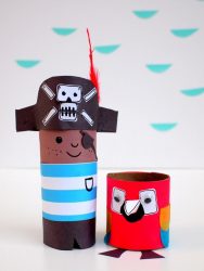 PIRATA Y SU LORO: Para hacer este personaje va a necesitar dos rollos de papel higiénico gastado, rotuladores, pegamento, tijeras y papeles de colores. Para el pirata será necesario un rollo de papel higiénico entero y… ¿adivine dónde está la otra mitad que hemos desechado para crear al loro? ¡Es la camiseta de nuestro malvado pirata! Unas cuantas pinturas y el resultado será súper genial.