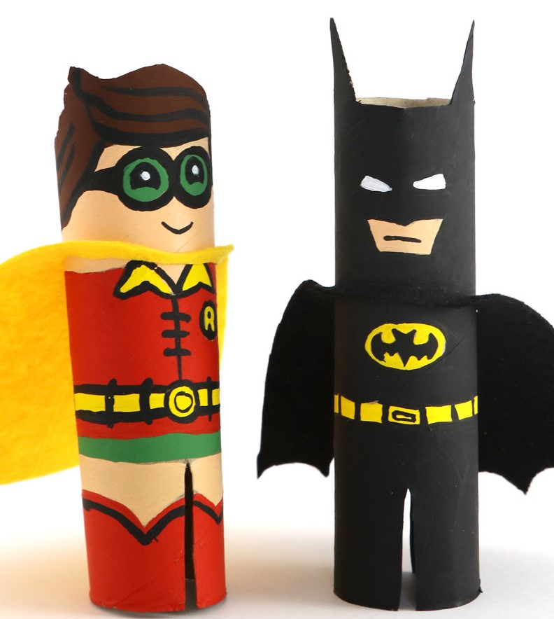 BATMAN Y ROBIN: Para realizar esta manualidad vamos a necesitar dos rollos de papel higiénico usado, papeles de colores, pegamento de barra y rotuladores. Para realizar estos personajes, le proponemos dibujar sobre los cartones tanto las orejass de Batman como el pelo de Robin y recortar el cartón en esa parte, luego dibujamos las formas del dibujo y las vamos coloreando. Lo único que debemos hacer es cortar una capa de color negra y otra de color amarillo para completar nuestra manualidad.