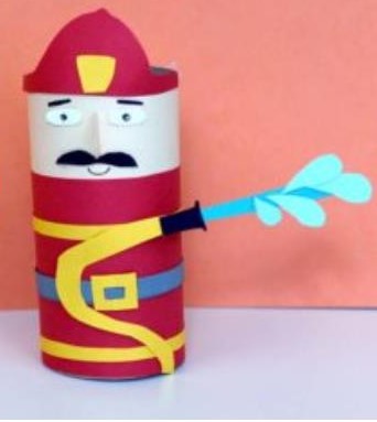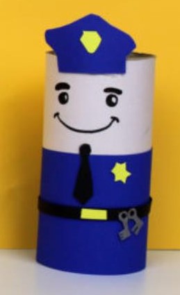 POLICIA: Para realizar esta manualidad vamos a necesitar un rollo de papel higiénico usado, papeles de colores, pegamento de barra y rotuladores. Comenzaremos forrando la parte de arriba del rollo con un papel color carne y la parte de abajo con uno color azul marino, haremos un cinturón con una tira de color negro y le añadiremos una hebilla de color amarillo, unas llaves de carcelero de color gris, una placa también amarilla, una gorra azul con un detalle amarillo y le pintaremos los ojos y una enorme sonrisa 🙂
