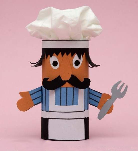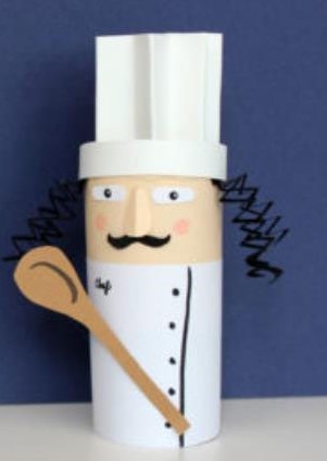 COCINERO: Para realizar esta manualidad vamos a necesitar un rollo de papel higiénico usado, papeles de colores, pegamento de barra y rotuladores. Le proponemos dos cocineros. Para realizarlos debemos forrar nuestro rollo por la parte de arriba con un color carne y la parte de abajo con un poco de papel de color blanco. Recortaremos unos ojos y un bigote. Para el pelo recortaremos unas tiras de cartulina negra y las doblaremos en zigzag (para uno de los modelos). Prepararemos una nariz y nos pondremos con el gorro, para eso utilizaremos un poco de cartulina blanca que iremos doblando en zig zag. Pegaremos todos los elementos y ya solo nos faltará fijar el sombrero para eso debemos introducirlo dentro del tubo. Debemos hacer una tira con una cartulina para tapar la parte de abajo y ya tendremos nuestro sombrero. Acabamos de decorar la chaquetilla le pondremos una cuchara de madera gigante y unos buenos coloretes y ya tenemos nuestro maravilloso chef listo 😉