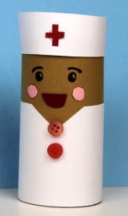 MÉDICO: Para realizar esta manualidad vamos a necesitar un rollo de papel higiénico usado, papeles de colores, pegamento de barra y rotuladores. Lo primero que vamos a hacer a cubrir la parte superior de nuestro tubo de cartón con un papel de color carne y la parte de debajo con un papel de color blanco que simulará la bata de médico podemos hacer un cortecito triangular en la parte del centro para añadirle un detalle más original. Para que la bata quede más graciosa, podemos añadirle dos pequeños botones. Recortaremos una tira de color blanco y le añadiremos una crucecita de color rojo justo en el centro esto no servirá para hacer el gorrito. A continuación le añadiremos la boca con una gran sonrisa de cartulina roja. Le añadiremos un poquito de rubor a las mejillas y… ¡¡¡LISTO!!!