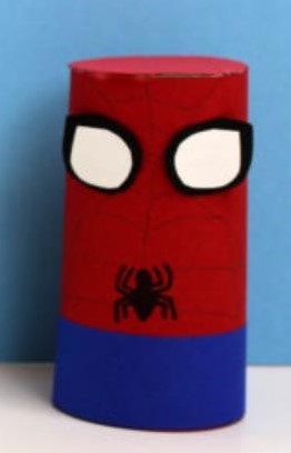 SPIDERMAN: Para realizar esta manualidad vamos a necesitar un rollo de papel higiénico usado, papeles de colores, pegamento de barra y rotuladores. Empezaremos cubriendo el tubo de cartón con un papel de color rojo intenso que nos servirá para hacer el particular traje de este personaje. Con un lápiz de color gris clarito vamos a dibujar unas telarañas dejando unos huequecito en los dos lados para hacer los ojos. A continuación cubriremos la parte de abajo del tubo de cartón con un azul eléctrico y para la parte de arriba haremos un círculo en color rojo que nos servirá para tapar el agujero. A continuación le haremos los ojos recortaremos en una cartulina de color negro una forma algo más grande y en una cartulina de color blanco algo más pequeña pero siempre la particular forma redondeada y un poquito puntiaguda para la parte de arriba simulando los dos agujeros que lleva Spider-Man máscara. Terminaremos de decorar a nuestro personaje con algunas telarañas más y también haciendo su insignia en forma de araña.