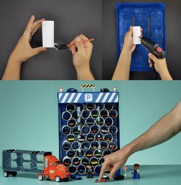 PARKING: Para realizar nuestro Parking necesitaremos varios rollos de papel higiénico sin papel, una caja de madera o cartón, pintura azul y blanca y pegamento. Debemos pintar los rollos con pintura blanca y la caja con pintura azul. Una vez se seque la pintura debemos pegar los rollos uno junto a otro dentro de la caja. Para finalizar, se puede pegar en el extremo superior de la caja un letrero de parking pintado por nuestros pequeños y ¡¡¡LISTO!!!