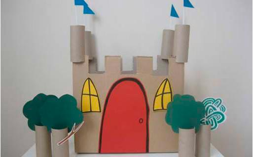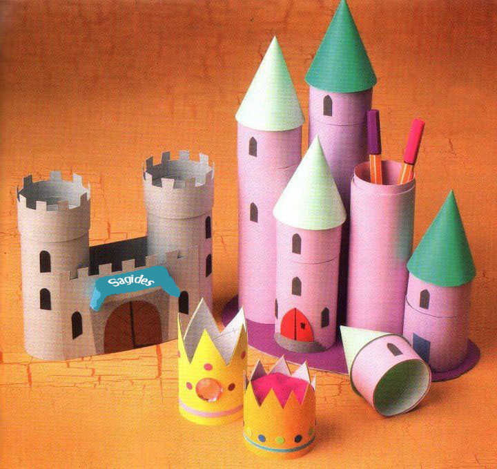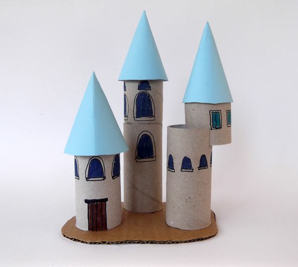 CASTILLO: Para construir este castillo de ensueño vamos a necesitar ocho tubos de papel higiénico, una caja de cartón pequeña, cuatro pajitas, cuatro hojas de papel o cartulina, tijeras, celo y rotuladores de colores.